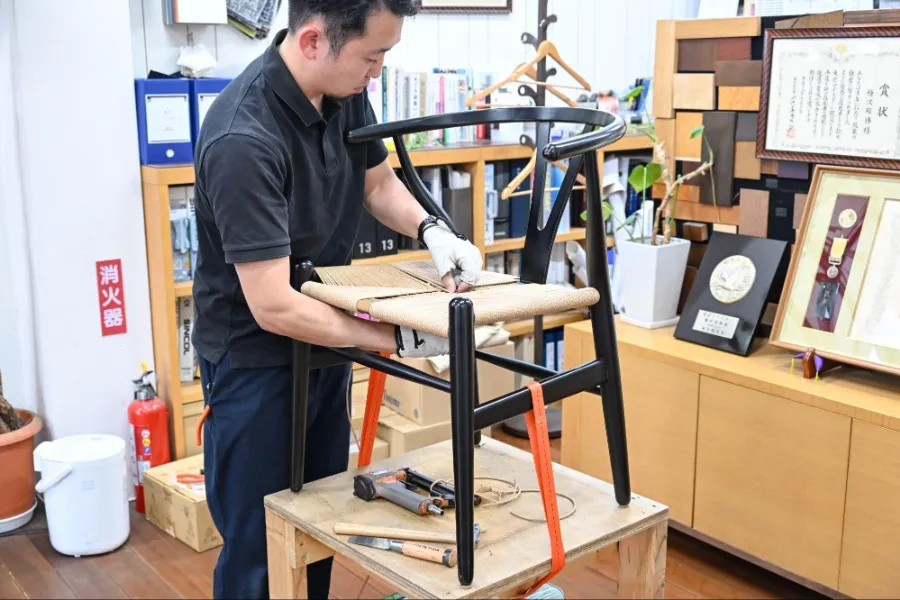 今回は、さまざまな職人さんの家具作りを間近で見学することができました。特に心を奪われたのは、デンマークの名作「Yチェア」の座面を編む作業。なんと120メートルものペーパーコードを、ひたすら編みつづけるんです。職人さんの手から繰り出されるコードは、まるで織物のように美しい模様を描いていきます。