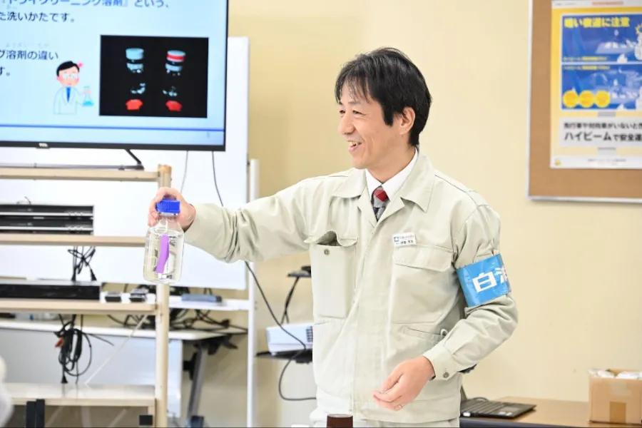 まずは社内の講義室にて座学の時間。そこで白洋舍の歴史や仕事について教えてもらったあと、クリーニングについて研究する研究員さんから面白い実験を見せてもらいました。水とドライクリーニング溶剤の違いを、折り紙とトイレットペーパーを使って実演。