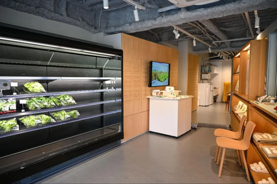 続いて見学に向かったのは、「LEAF FACTORY TOKYO」。入った瞬間、おしゃれな店内の雰囲気に「あれ?工場じゃなくてカフェに来ちゃった?」と思わず見回してしまいました。こちらの工場では、完全人工光型の栽培方法を実現しており、IoT技術を駆使した最新の農業に取り組んでいるのだそう。