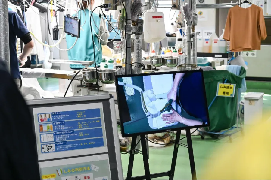 ドライクリーニングを担当するフロアでは、13台ものドライ機が整然と並び、1日最大6,000点もの衣類を処理できるそう。さらにその隣では、しみ抜きの達人が実演を見せてくれました。