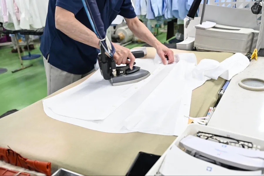 最後は仕上げ作業。スチームの立ち込める中、技術者たちが一着一着丁寧にアイロンがけをしていきます。