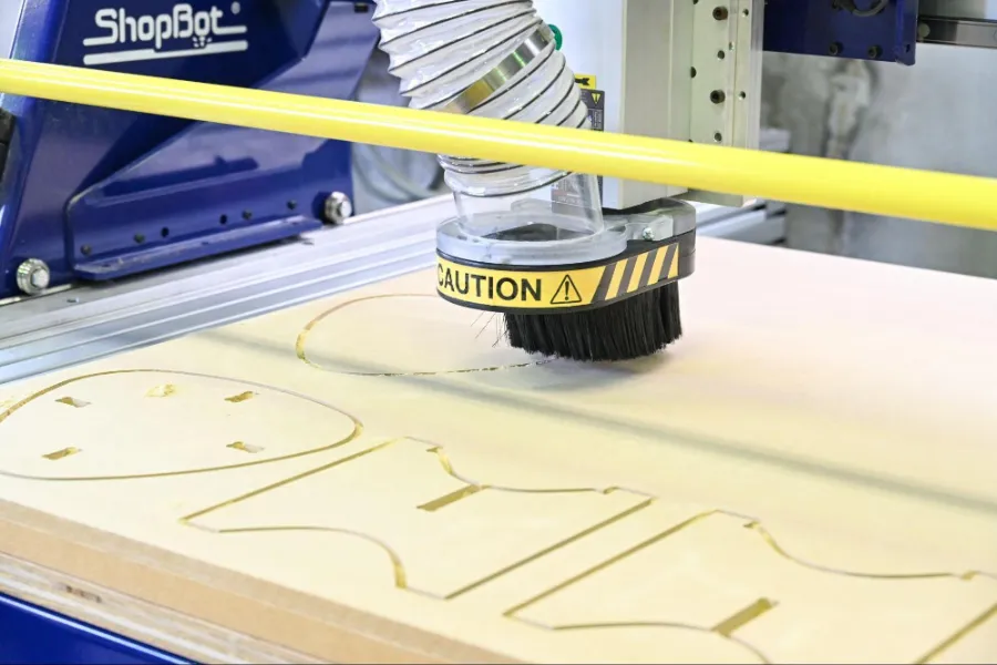 工房の奥に進んでいくと、大きなCNCルーター「Shot Bot」が鎮座しているのが見えてきましたよ!こちらの機械では、中にあるビットという刃物が高速回転して、どんな形でも削り出せるのだとか。