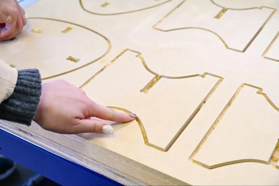 あらかじめ製作された図面データを使って、機械を動かすと、大きな音とともに木材が削られていきます。その様子はまるでプラモデルのランナーのよう!正確で素早い動きに、思わず釘付けになってしまいました。