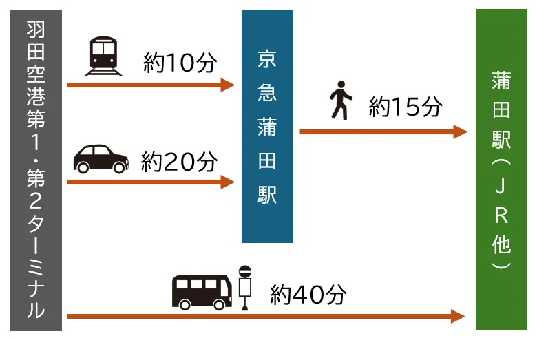 「京急蒲田」駅と「蒲田」駅のあいだは徒歩約15分。「蒲田駅に直行したい」「スーツケースを引いて徒歩15分は大変」という方は、「蒲田」駅へそのまま連れて行ってくれる、バスルートを使いましょう!