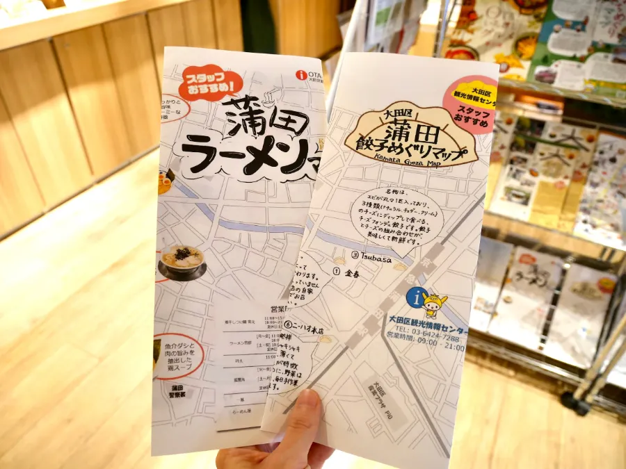 各種パンフレットが置かれているラックにあった「蒲田ラーメンマップ」と「蒲田餃子めぐりマップ」。大田区観光情報センターのスタッフがおすすめのお店を紹介する、手作りのマップでした。ところどころ手書きで書きこまれていて、あったかさを感じます。