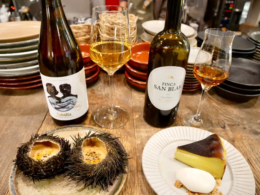 クリーミーで濃厚な冷製スープのような「雲丹のクレマ(600円)」には、オレンジワイン(白ワインの一種)の「タウリャ(100cc 1,500円)」を、今にも溶けだしてしまいそうなほどツヤツヤ、とろっとろの「バスクチーズケーキ 濃厚ピスタチオ(800円)」には、貴腐(きふ)ワインの「ドゥルセ(100cc 1,250円)」をペアリング。