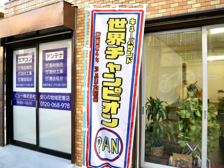 JUURIから京急蒲田駅を挟んで反対側、東口方面の「京浜蒲田駅前通り」を歩くと……、急に現れる「キューバサンド 世界チャンピオン」の旗。