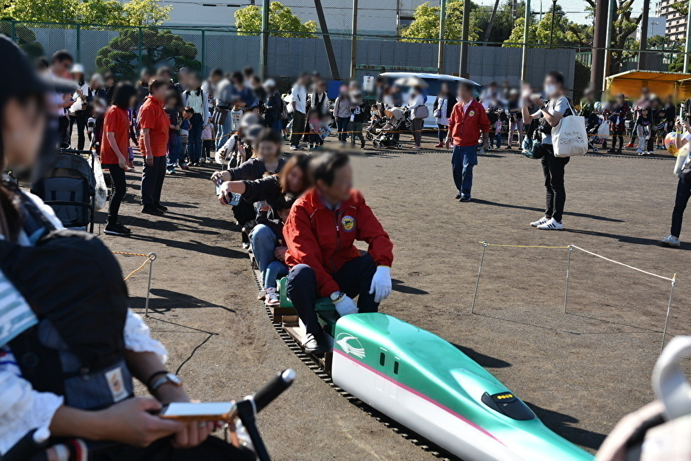子ども連れに大人気のミニ新幹線は、東北新幹線「はやぶさ」のようなカラーリング。大人も子どももニッコニコで乗車していました。うらやましー!!