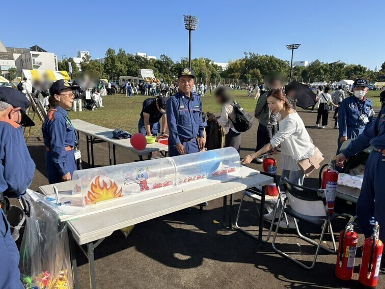 気を取り直して参加したのが、「消防ふれあいコーナー」。消火訓練を体験でき、妻も他の子どもたちに混じって楽しそうにしていました。