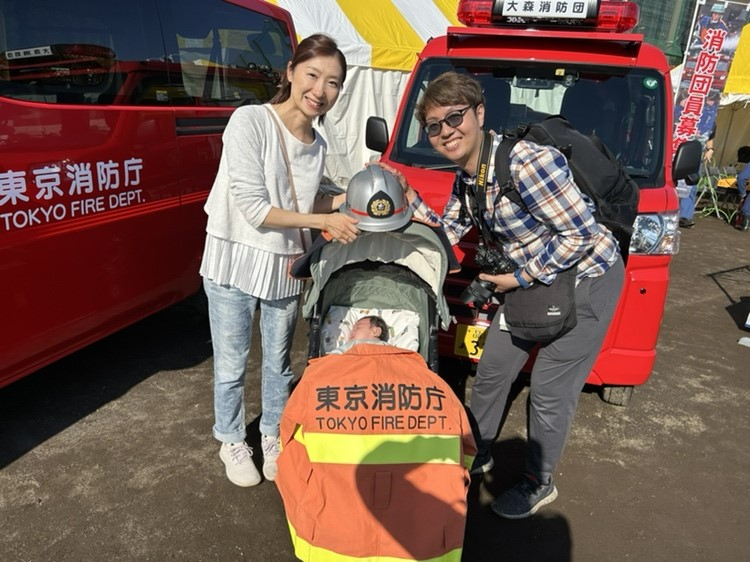 消防車の前で記念撮影。消防士さんが気を利かせて、「東京消防庁」の文字が見えるように息子の胸の上にオレンジの制服をかけてくれました。