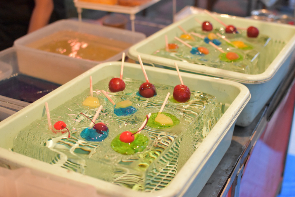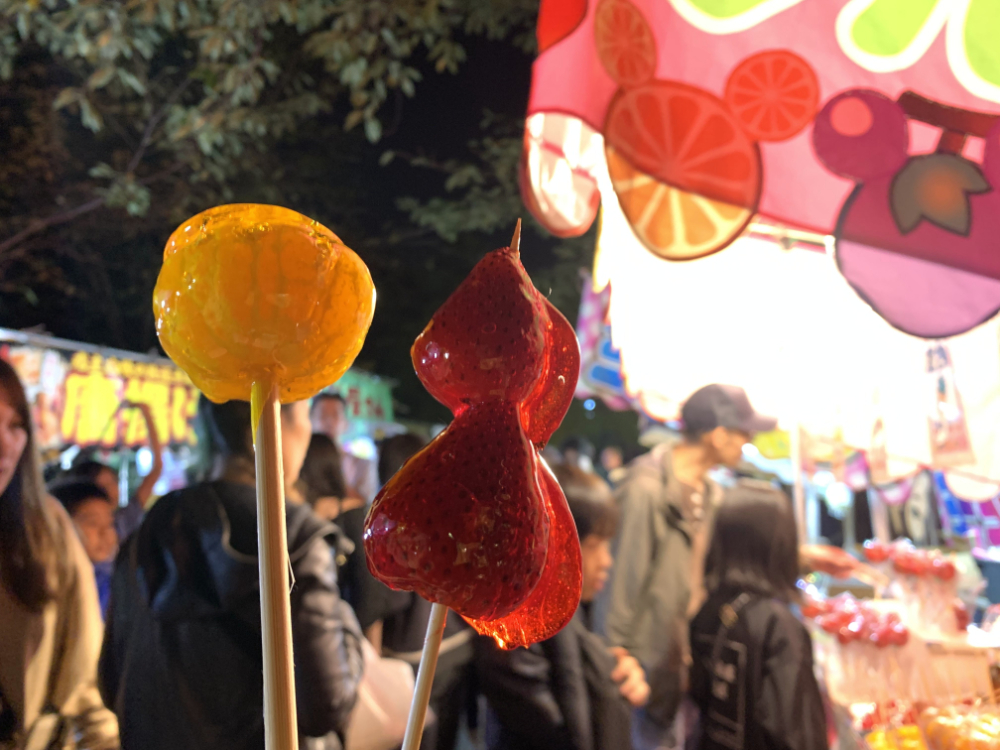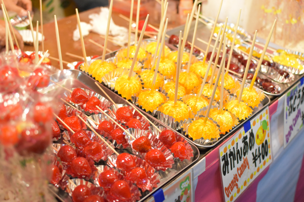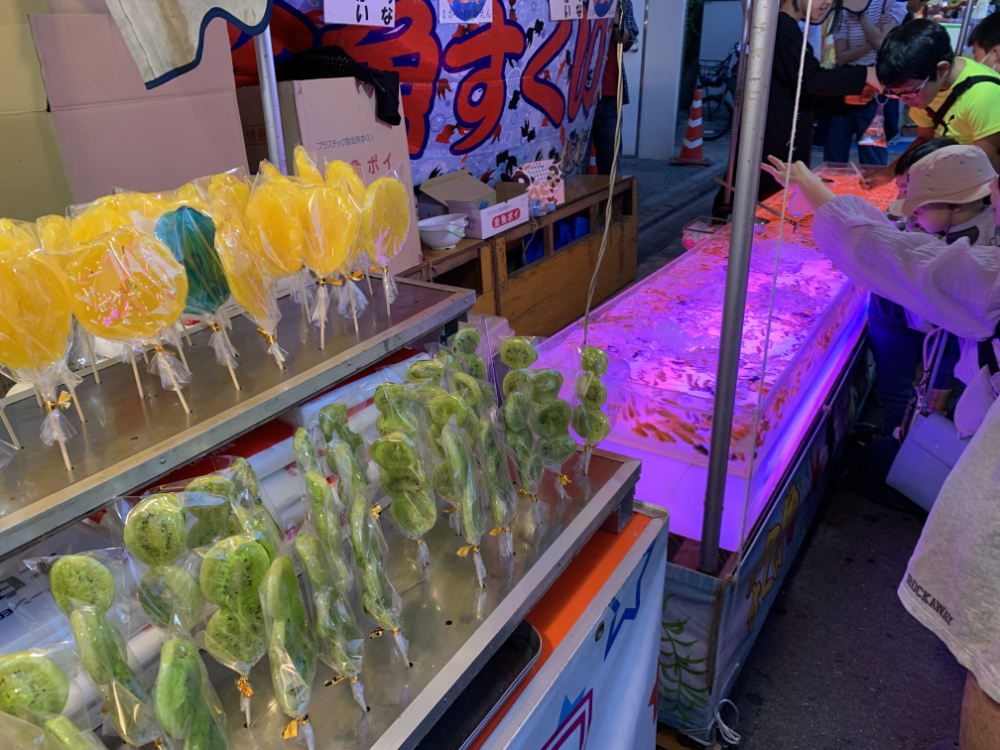 お祭りの定番、りんご飴やあんず飴も、フルーツ飴と冠してキウイやイチゴ、みかんなどが並ぶ屋台もありました。初めて見たので、どれどれひとつ……と食べてみると、飴でコーティングされたカリッとした表面と溢れ出るジューシーさに驚き! 飴をまとわせる際に加熱されるからなのでしょうか、フルーツの甘味が増強されていて、とっても美味しかったです。