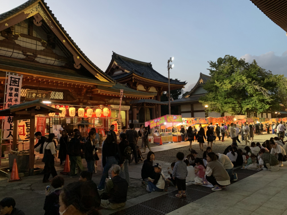 境内にも屋台がたくさん並んでいます。仁王門から大堂にかけての広場にはぐるりと屋台が立ち並び、五重塔のほうに続く小道には両側に屋台が並んでいて、満員具合がすごかったです。20時以降、クライマックスに向けて人が多くなるので、もし小さなお子さま連れで行かれる場合には、早めの時間がおすすめですね。
