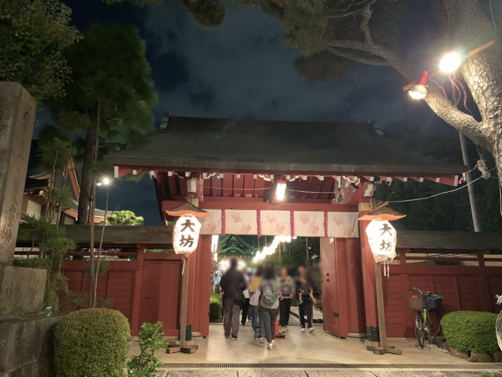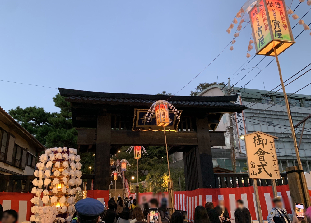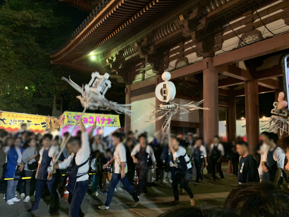少し薄暗くなってきた18時ごろ、総門の前に到着すると、太鼓や笛が奏でるお囃子に合わせて纏(まとい)を振る先導、それに続いて万灯が続々と境内に向かって入っていくのが見えました。