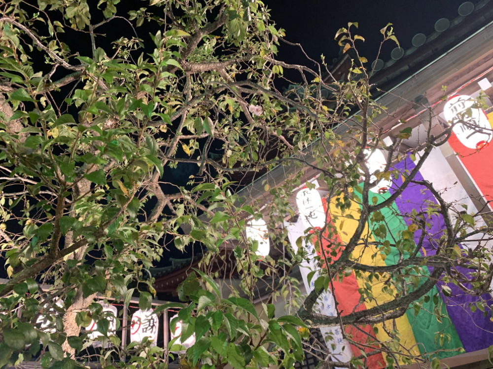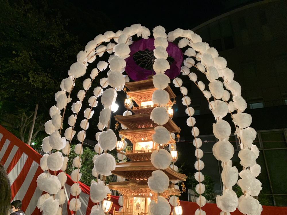 ちなみに、万灯とは花飾りのついた提灯のようなもので、五重塔と桜を表現しています。日蓮聖人の入滅の際、10月だというのに桜の花が咲いたという言い伝えから飾られるようになったそうです。