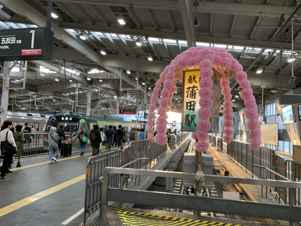 お会式当日、東急池上線の蒲田駅で乗り換えたのですが、ホームには「献燈 東急 蒲田駅」と書かれた花飾りのついた万灯が飾られていました。電車も臨時ダイヤが運行され、14時から23時台まで、上下線各28本増発されています。