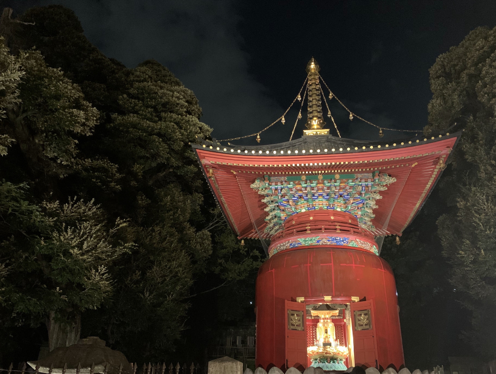 池上本門寺の多宝塔は国指定重要文化財です。ご開帳されるのは1年のうち、10月12日いっぱいと13日の午前中のみだそうで、とても貴重なものを見ることができました。夜空に浮き立つ朱塗りの外観と、ご開帳されて中が黄金に輝く多宝塔は、とても幻想的。夜のほうが、神々しさが際立っておすすめです。