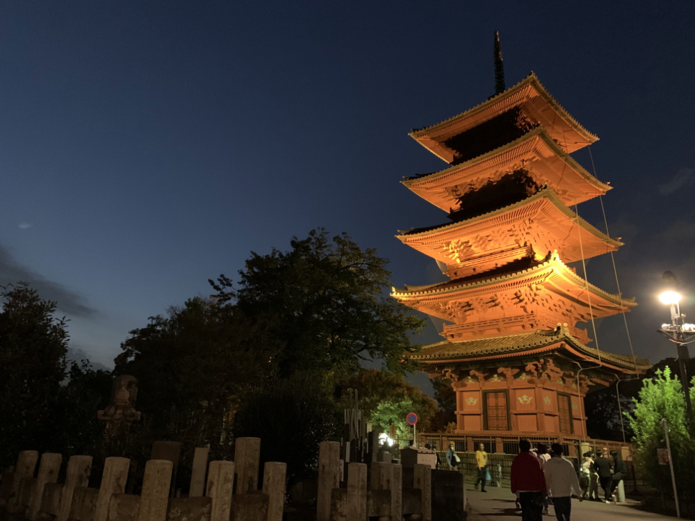 本殿の横から続く、提灯がきれいに灯る大坊坂(だいぼうざか)を下ると、途中の右手にライトアップされた多宝塔(たほうとう)が見えてきます。