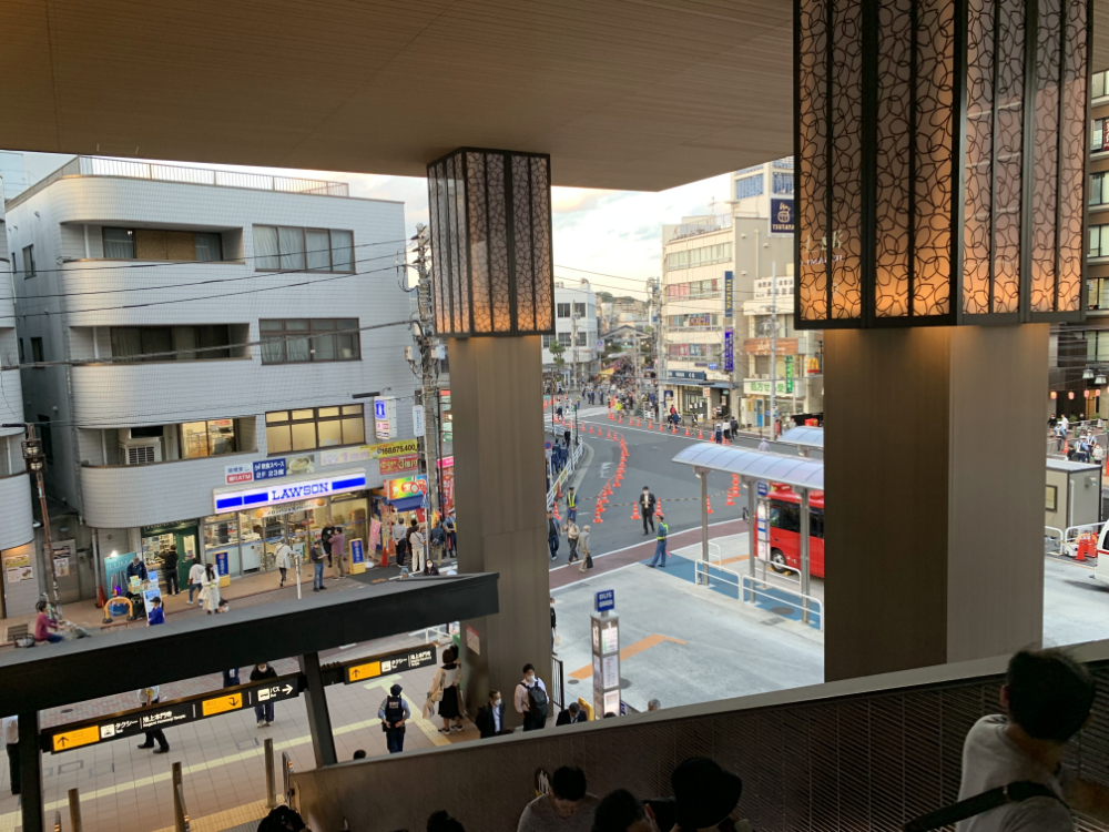 10月12日の16時半ごろ池上駅に降りると、通常の改札口のほか、臨時出口も設置されていました。駅前のバスターミナルも、大勢の警察官によって交通規制が敷かれています。お会式は11日から始まりますが、12日は万灯練行列が行われるため、バスや車の車両通行止めの範囲が広がり、車が通らなくなった道路には屋台がずらりと並ぶそうです。