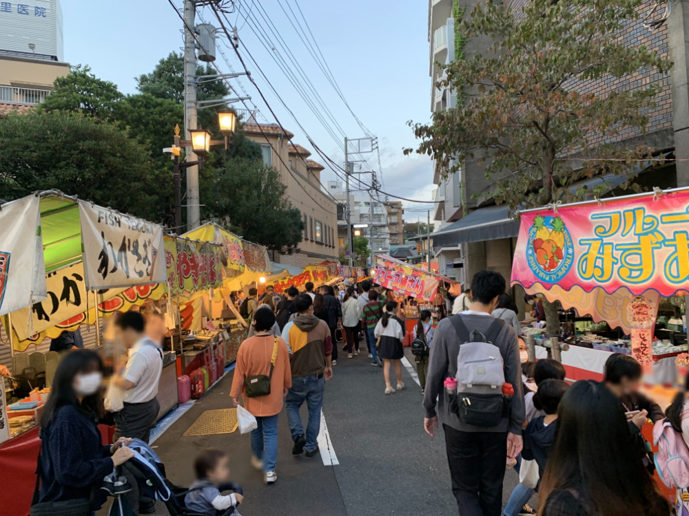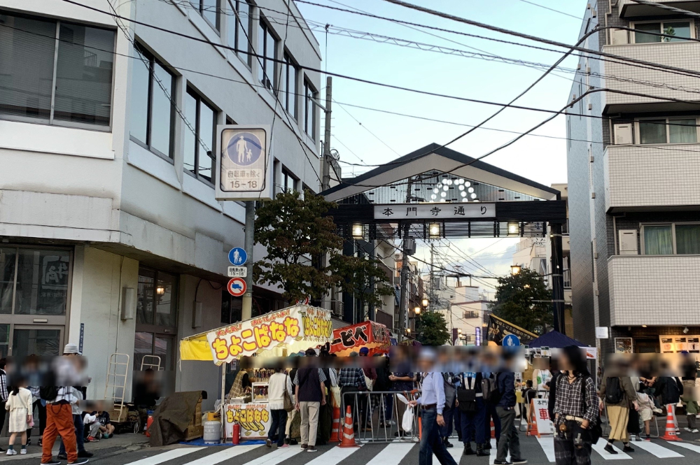 池上駅から池上本門寺に続く旧参道「本門寺通り」に向かうと、チョコバナナ、たこ焼き、ベビーカステラなどなど、たくさんの屋台が並んでいました。