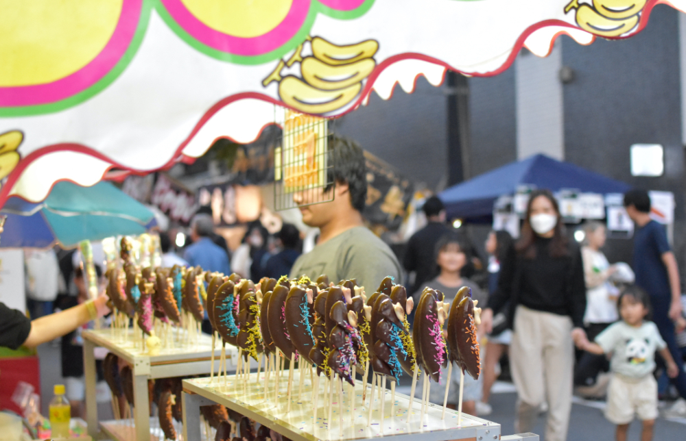 食べ物系だけでなく、射的や輪投げ、スーパーボールすくいなどのゲーム系の屋台も多く、大人も子どもも楽しそうに興じていました。また、露天商の本格的な屋台だけでなく、地元のお店が出しているブースもあり、アットホームな雰囲気でした。