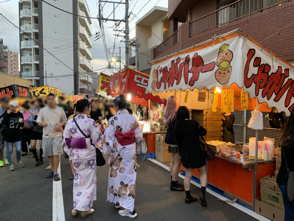 ご家族連れ、仕事帰りのサラリーマン、学校帰りの高校生、地元の子供たちに混じって、浴衣姿で楽しむ方々も発見しました。風情があっていいですよね。海外からの観光客も多く、屋台フードを楽しまれていました。