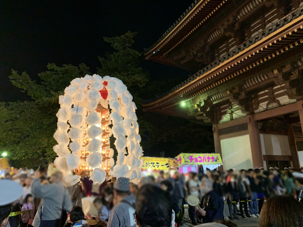 万灯の大きさや形は講中(こうじゅう。信徒の集まりのこと)によって異なるようで、五重塔を模したもの、行灯型のもの、複数の提灯をつけた巨大なものなどさまざまです。夜も深い時間になるほど、講中の人数も増え、万灯の大きさも巨大化していっていました。池上本門寺の仁王門の梁は、万灯練行列が支障なくくぐれるよう、通常より下層の桁と梁の高さが高くなっているそうなのですが、その梁をギリギリくぐって入ってくるような巨大な万灯もありました!