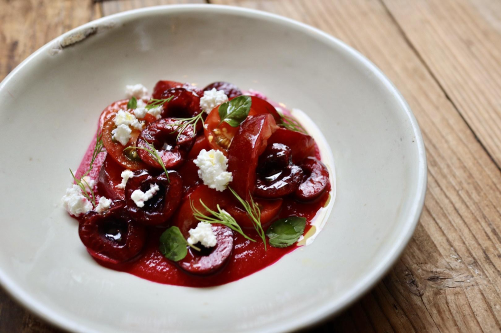 食材はアメリカンチェリーやプラム(すもも)、チェリートマトを使い、下にはビーツのサルモレホソースが敷かれています。