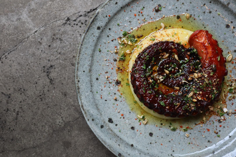 「ガリシア風タコの鉄板焼 麦芽と鳩麦のデュカ」も運ばれてきた瞬間、芸術作品かと思わせるような見た目です。