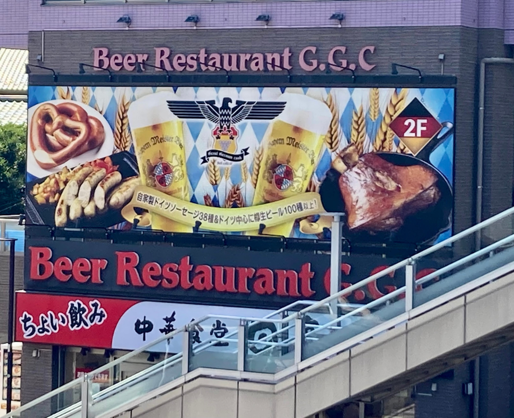 京急線「京急蒲田」駅の出口を抜けると、大きな看板「Beer Restaurant G.G.C」が目に飛び込んできます。