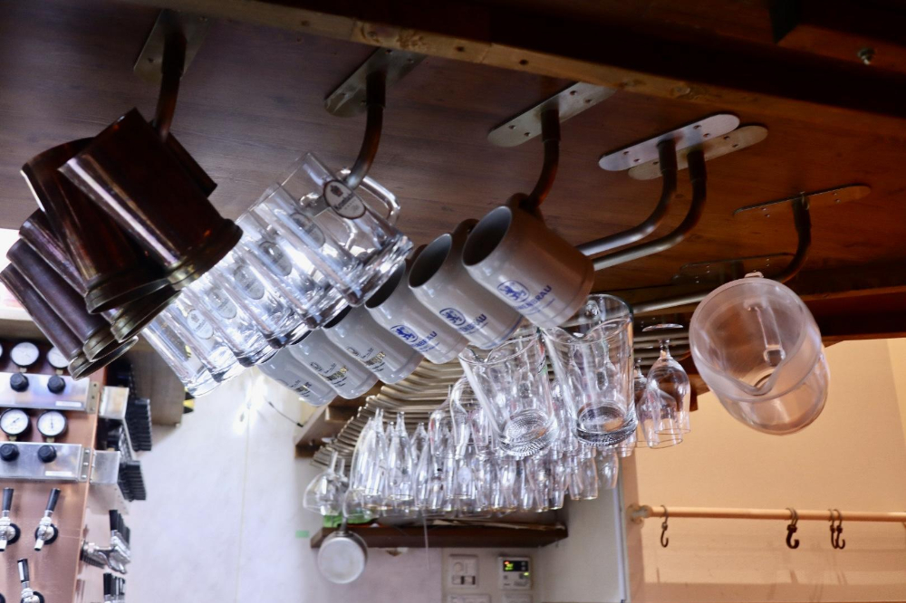 ビールサーバーと同時に目に映るのは、天井に掛かった「ビアグラス」や「ビールジョッキ」の数々。