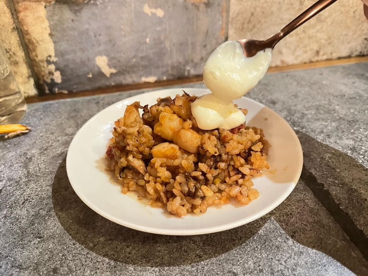 最初は何も付けずパエリアそのものを楽しんでみます。そのあとアリオリソース(ニンニク入りマヨネーズ)を付けてみると、深みのあるソースがパエリアの旨みを引き立ててくれます。このソースも中毒性のある美味しさで、どんな料理にも相性がいいと思いました。