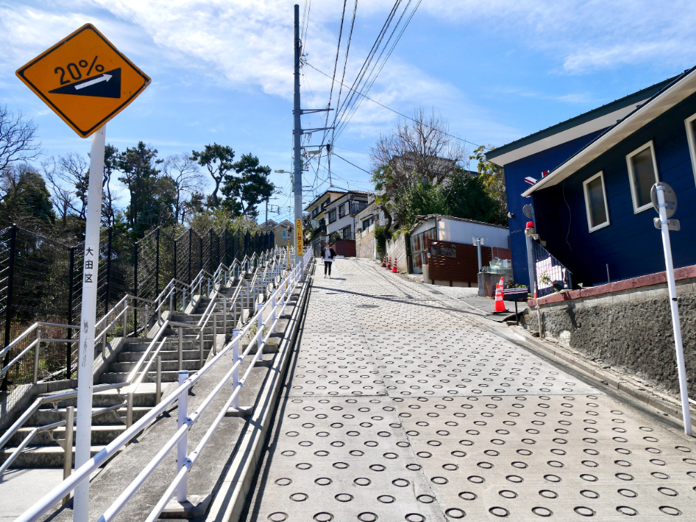 臼田坂に向かう道中に見つけたこのとんでもない坂は、佐伯山緑地と呼ばれる小高い丘の脇にあります。なんと勾配は20%。本記事で紹介している坂のなかで、勾配の標識を見たのはここだけです!