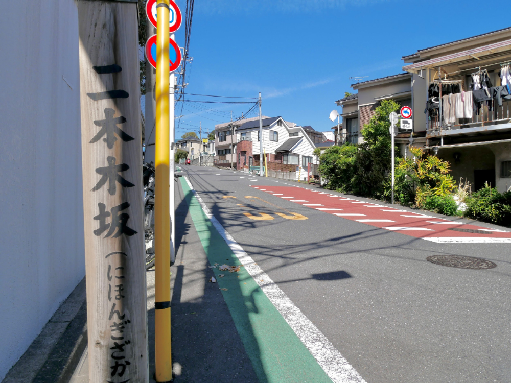由来はこの辺りの昔の地名、「馬込村小字二本木」から。かつては大きな二本の木でも立っていたのでしょうか。ただ坂を上るのではなく、由来を知ってから上ってみると、昔の風景や住んでいた人々について、具体的にイメージできるので楽しいです。