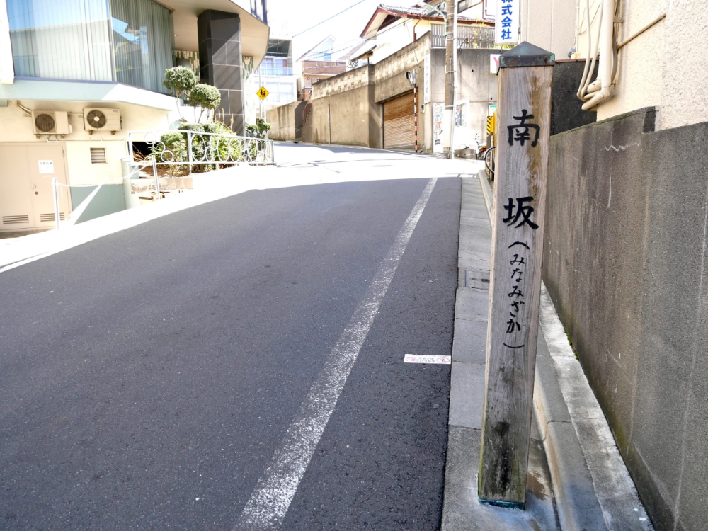 すぐ見つかったのも当然。二本木坂と南坂は昔、一本の道としてつながっていたようです。この古道は馬込の氏神さまである「八幡神社」から、旧池上村の根方(現在の仲池上一丁目付近)まで通じた道でした。南坂の名前は「八幡神社より南にある」というシンプルな由来です。