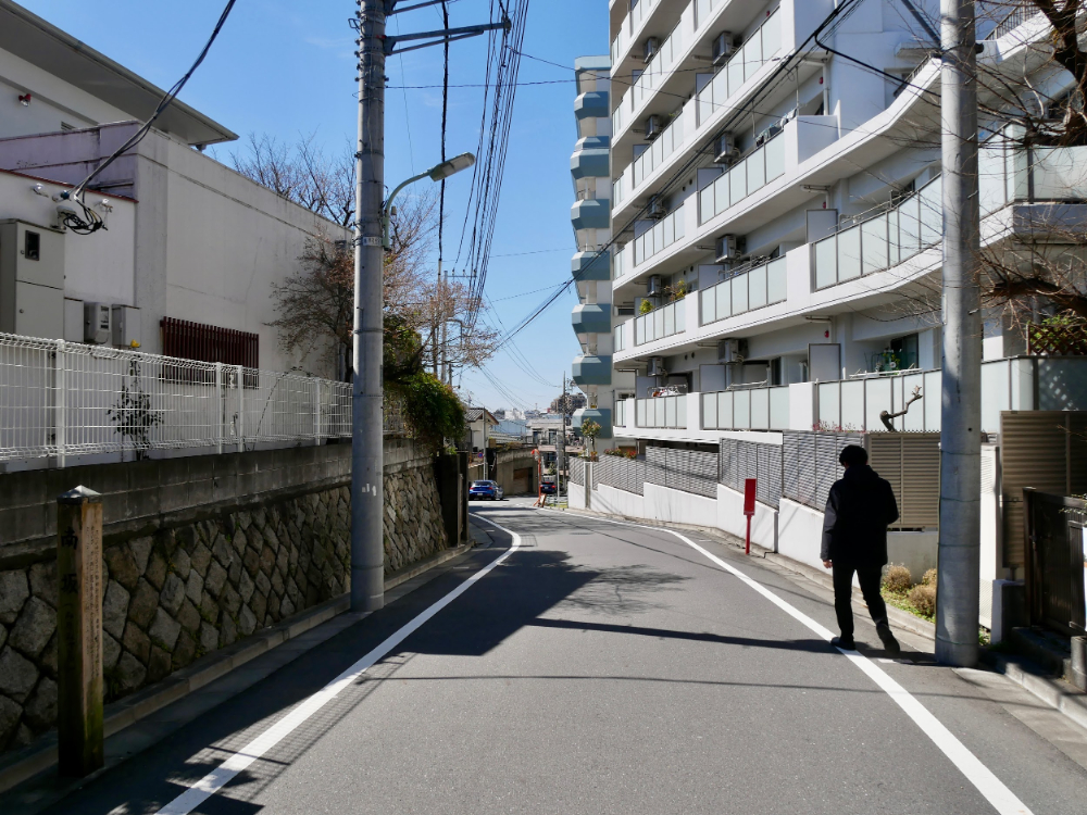 馬込坂のふもとから脇道に入るとすぐ現れたのが二本木坂。近くにグラウンドがあり、子どもたちの元気な声が響きます。馬込らしいのどかな雰囲気を感じながら、住宅街のなかをまったり歩ける坂道でした。