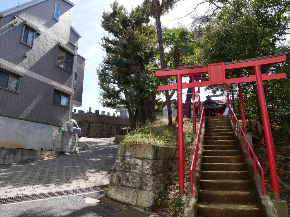 大田区のホームページやGoogle マップを確認すると、たしかにこの場所なのですが……、ここだけ標識は確認できませんでした。ちょっと見つけにくいかもしれませんが、赤い鳥居の出世稲荷神社が坂の目印です。