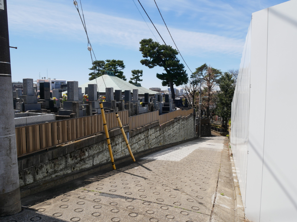 現在は写真の通り、墓地の反対側は壁で覆われ、工事中のようです。おだやかな昼間に行ったからか、墓地のそばでもまったく怖さはありませんでした。背の高い建物がないので、遠くまで続く青空がよく見えます。不思議と爽快感のある景色でした。