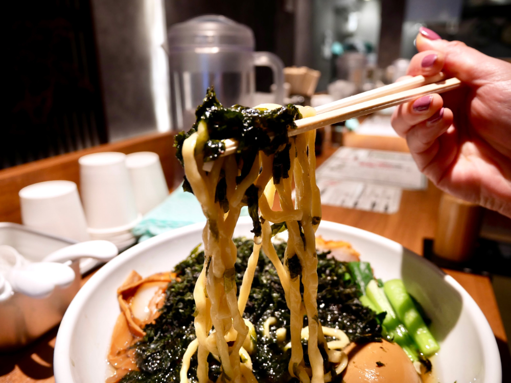 ラーメンもまぜそばも、使われているのは同じ中太のちぢれ麺。食べはじめのまだパリパリ、サクサクしている海苔に麺がよく絡み、食感が楽しいです。