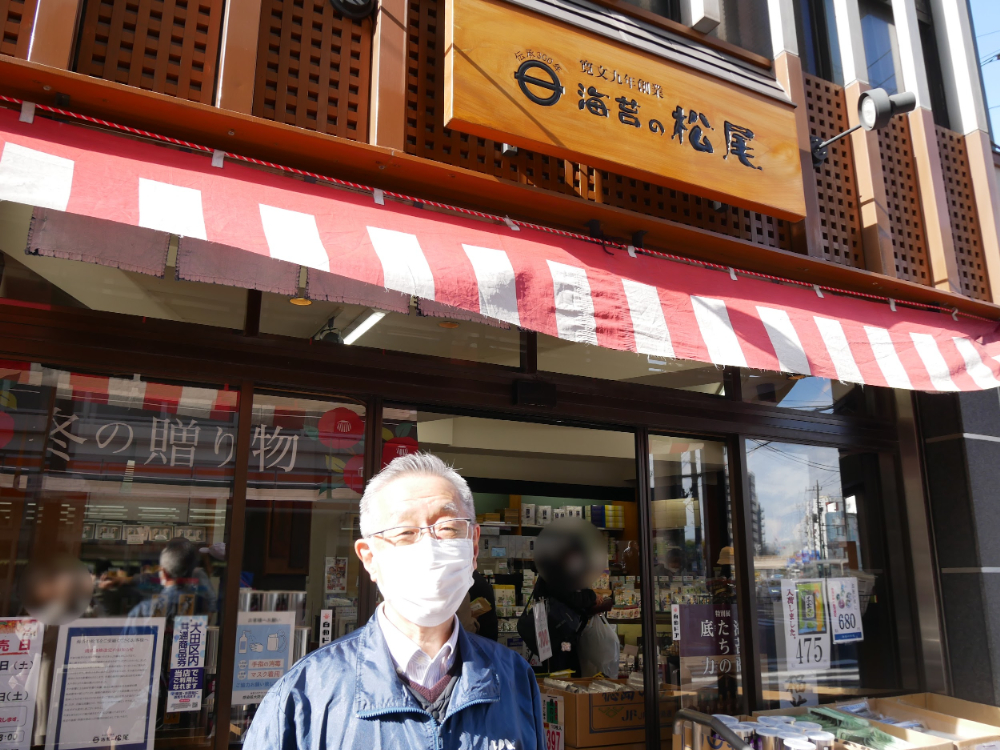 「海苔の松尾」の創業は、なんと1669年。350年以上の歴史をもつこのお店は、大森で初めてできた海苔問屋なんだそうです。そんな「はじまりのお店」は、海苔づくしの1日の開幕にふさわしいはず! まずはここから立ち寄ってみましょう。