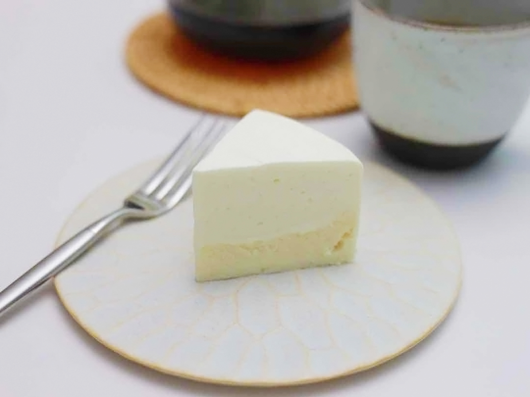 ケーキの内側にも生クリームやフルーツは入っておらず、真っ白。よく見ると、上層はレアチーズケーキ、下層はベイクドチーズケーキの2層になっています。白と白で作る層がなんとも言えない上品さ。