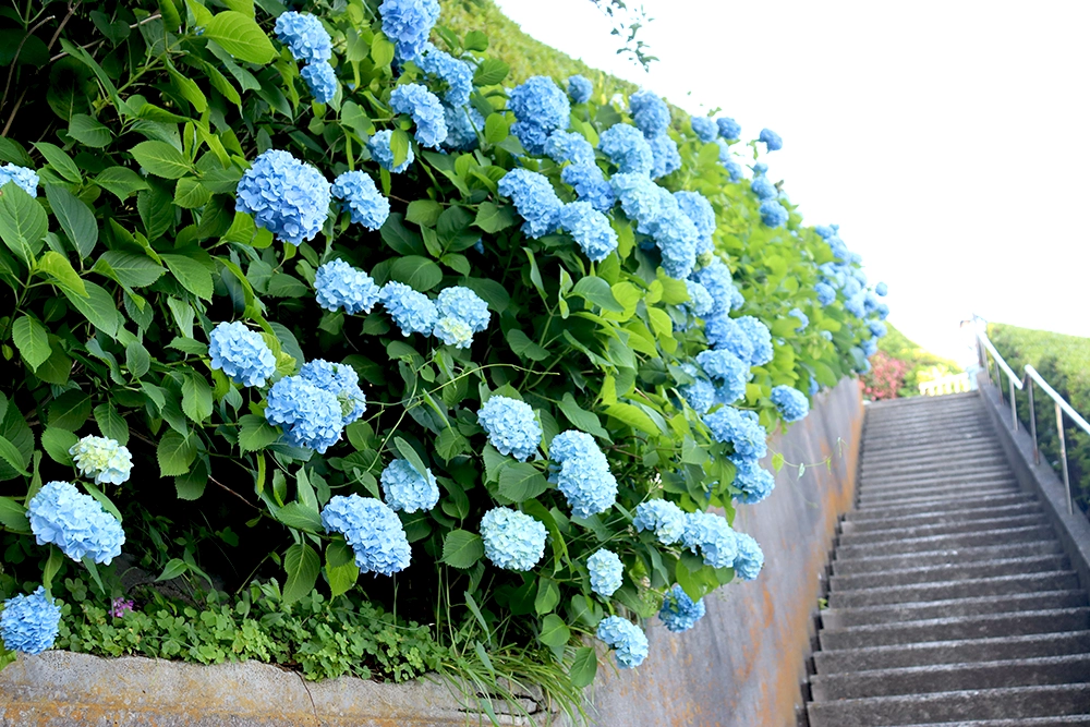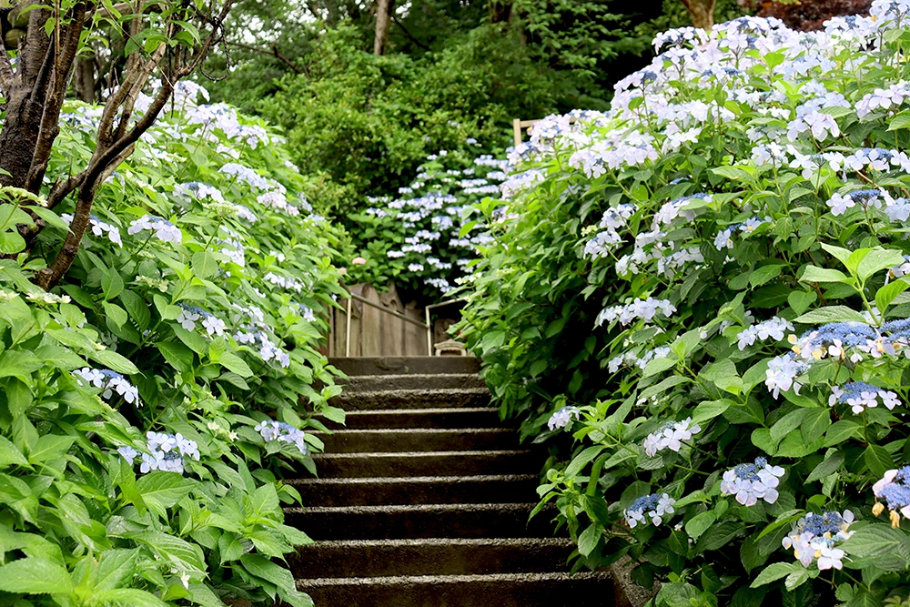 両脇に紫陽花が咲く階段はおすすめ写真スポット