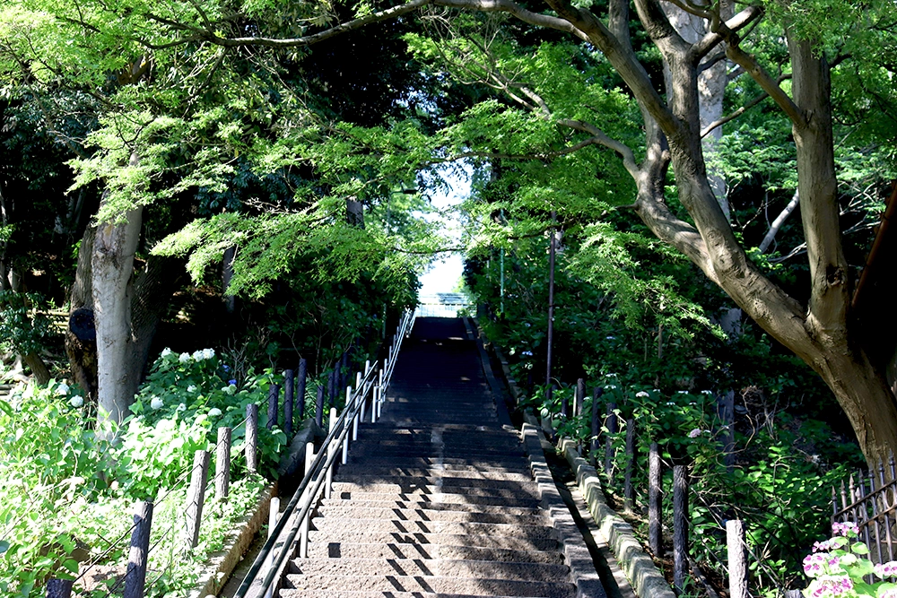 (紫陽花の写真は2025年6月5日に撮影したもので、境内は満開で、階段沿いは8分咲きくらいでした)