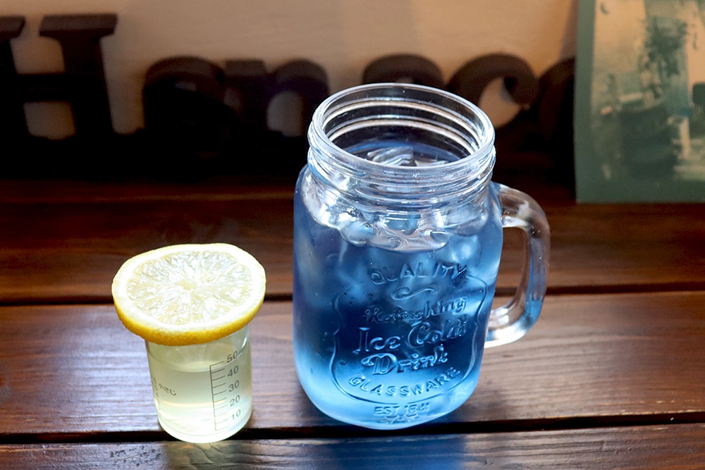 レモンを絞ると青色から紫色に変化