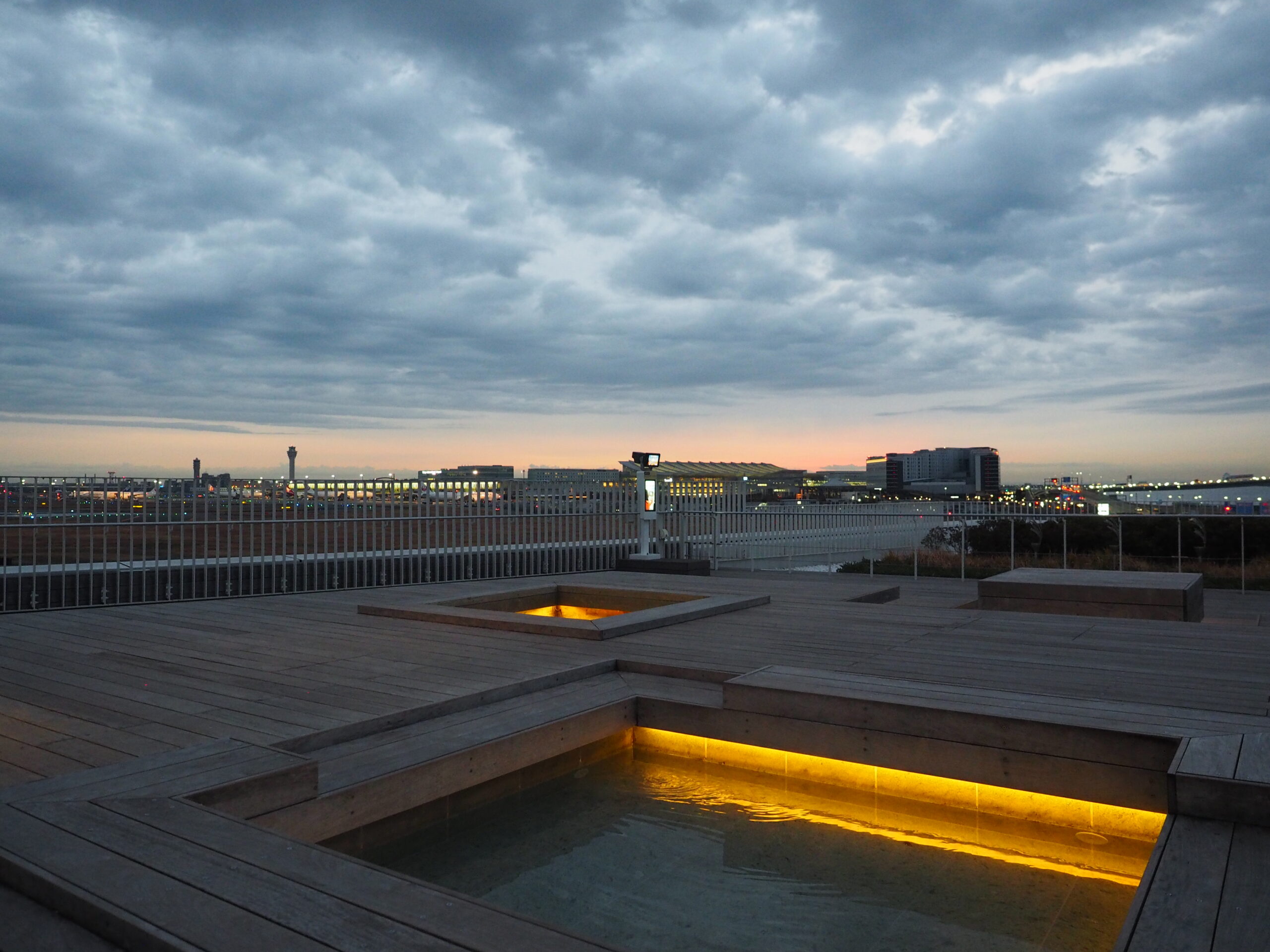 屋上にある「足湯スカイデッキ」では、羽田空港を離発着する飛行機を眺めながら無料の足湯に浸かることができます。