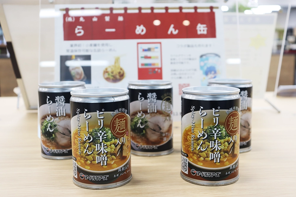 この「らーめん缶(500円)」は、大田区上池台にある丸山製麺が手がけた業界初の小麦麺を使ったもの。缶を開けると、具材と麺がスープに浸かった状態ですぐに食べられるという優れものなんです。