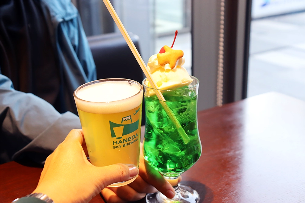 「羽田レタスエール」と「メロンクリームソーダ」で同じ緑色の泡で乾杯をしました。