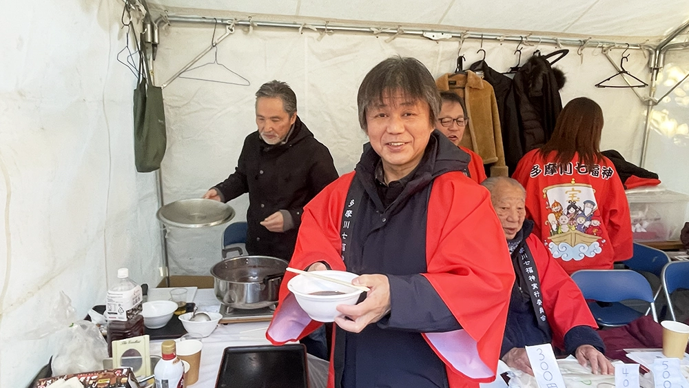 ゴールでは多摩川七福神実行委員会のみなさんが、温かいお汁粉やお神酒を振る舞ってくださいました。(※毎年三が日とそれに続く土日のみです。)