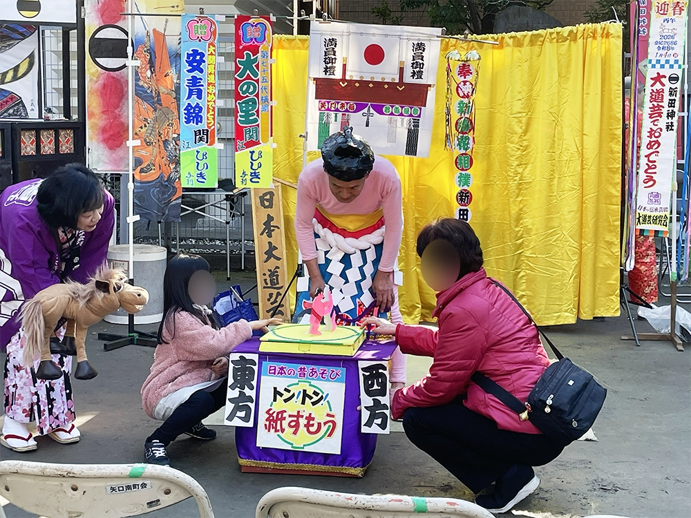 新春花相撲新田神社場所では、手づくりの化粧まわしをつけた演者が聴衆も巻き込み、土俵入りから紙相撲での結びの一番、