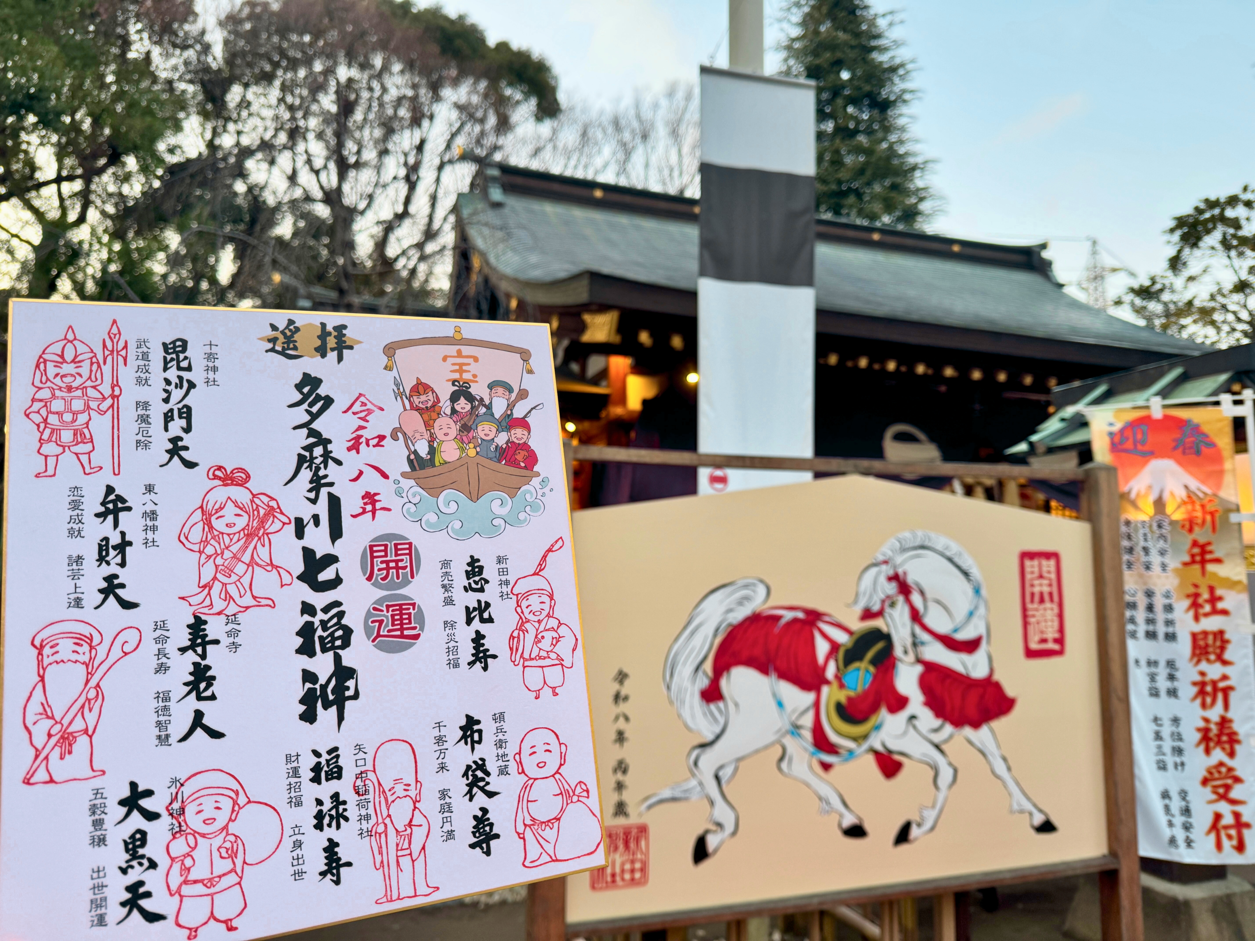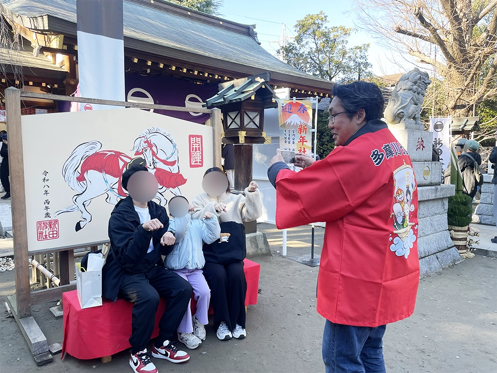 境内には絵馬の前で記念撮影できるフォトスポットもあって、多摩川七福神実行委員会のみなさんの呼びかけで、午年にふさわしく馬ポーズを決める親子の姿にほっこり。