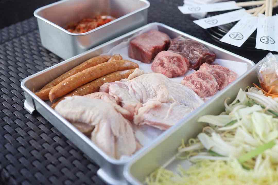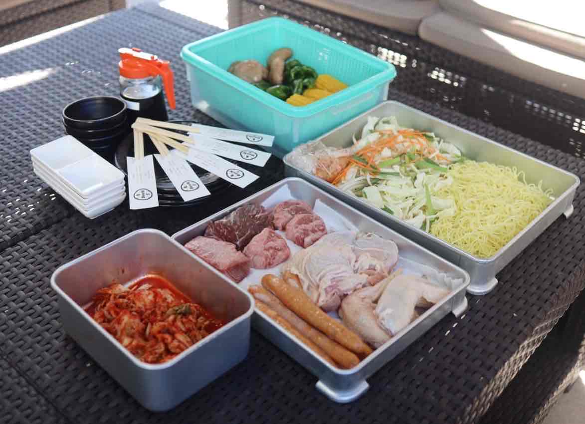 予約しておいたのは「BBQ気軽セット」です。カルビ、ハラミ、鶏の手羽先など6種類のお肉と野菜盛り、ホルモン焼きそばがついた気軽ながらしっかりBBQを満喫できるラインナップ。
